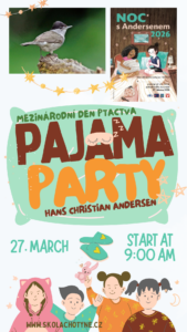 U příležitosti 26. ročníku Noci s Andersonem pořádáme ve škole a v místní knihovně Pyžamový den. Letos oslavíme i Mezinárodní den ptactva a seznámíme se s Pěnicí černohlavou, která se stala ptákem roku 2026.